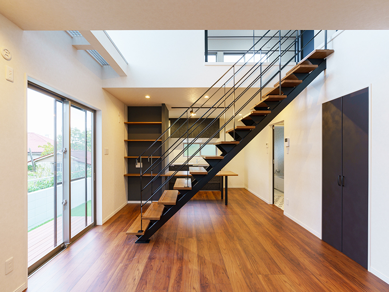 空間を広々と見せる工夫。鉄骨階段はリビングとキッチンを区切る事なく、部屋を大きく感じさせてくれます。